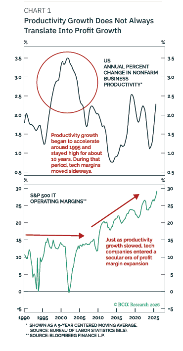 우리가 지속적으로 강조해온 핵심 포인트는, 생산성 증가가 항상 이익 증가로 이어지는 것은 아니라는 점이다. 닷컴 시대를 생각해보라. 생산성 증가는 1995년경부터 가속화되기 시작해 약 10년간 강세를 유지했다. 그러나 그 기간 동안 테크 마진은 정체 상태였다. 이익이 더 빠르게 증가하지 못한 것이 2000년 인터넷 주식 붕괴의 핵심 원인 중 하나였다.