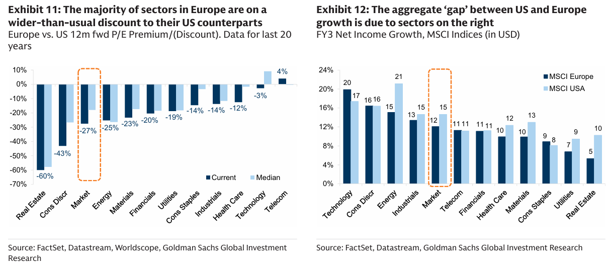 Exhibit 12: 미국과 유럽의 성장 격차는 오른쪽에 있는 특정 섹터들 때문에 발생한다
