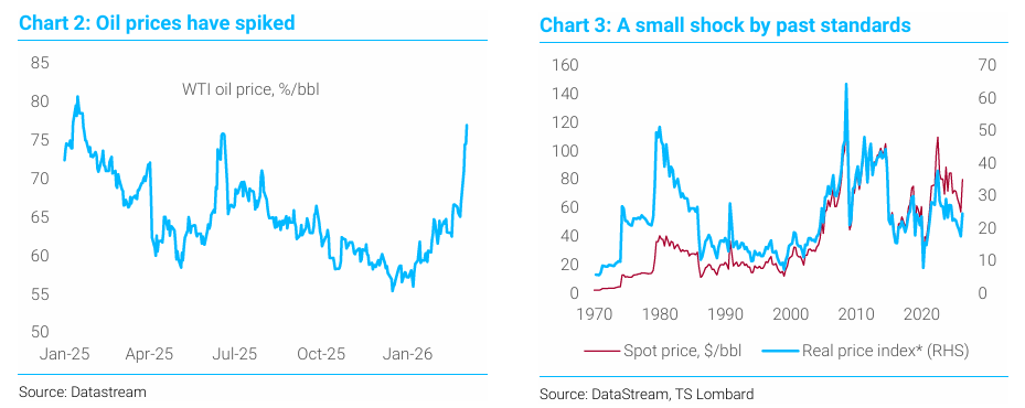 중동에서 갈등이 발생하면 언제나 그렇듯 시장의 즉각적인 초점은 유가에 맞춰진다. 유가는 2월 중순 대비 약 배럴당 15달러(20%) 상승했다. 역사적으로 보면 이것은 매우 큰 충격은 아니다. 1973년 석유 금수 조치 당시에는 가격이 세 배 상승했기 때문이다.