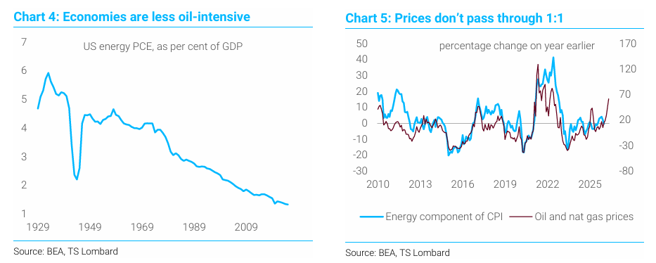 하지만 이번 상승도 글로벌 인플레이션을 높일 것이다. 좋은 소식은 대부분의 주요 경제가 과거보다 중동 원유에 덜 의존한다는 점이다. 이 지역은 여전히 세계 생산의 약 31%를 차지하지만(1970년대 34%에서 감소), GDP 대비 에너지 사용 강도는 약 3분의 1 수준으로 낮아졌다. 이는 유가가 더 상승하더라도 50년 전과 같은 충격이 아닐 가능성이 높다는 의미다.