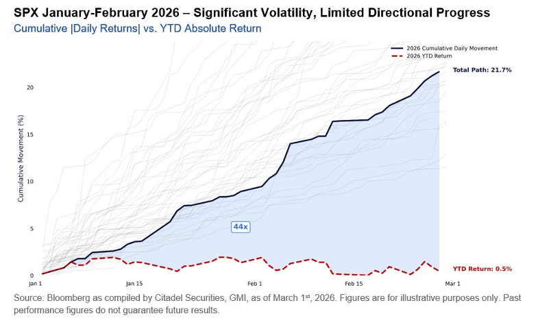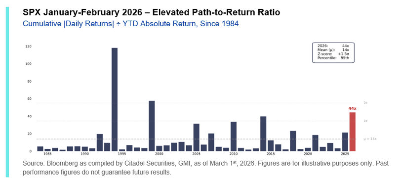 2월까지의 누적 절대 일간 변동폭은 지수의 절대 수익률보다 44배 더 컸으며, 이는 약 40년 데이터를 기준으로 95번째 백분위수에 해당한다.
