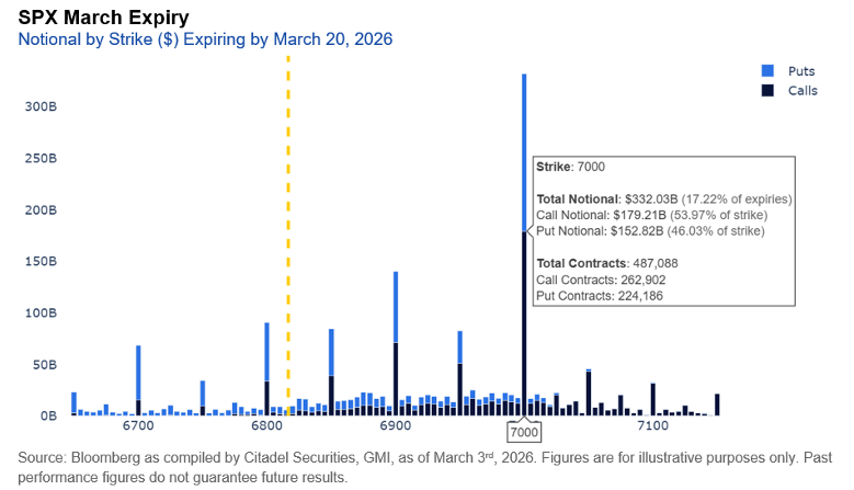 SPX March Expiry – Notional by Strike ($) Expiring by March 20, 2026