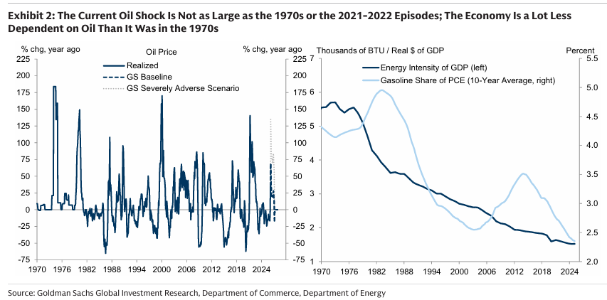 우리는 금리 인상이 가능성이 낮다고 본다. 첫째, 현재 공급 충격의 규모와 범위는 과거보다 덜 우려스럽다. 심지어 GS의 극단적 유가 시나리오에서도 1970년대보다 작은 충격이며, 2021~2022년보다 지속기간도 짧다(Exhibit 2 좌측). 또한 현재 경제는 1970년대보다 석유 의존도가 훨씬 낮다(Exhibit 2 우측).