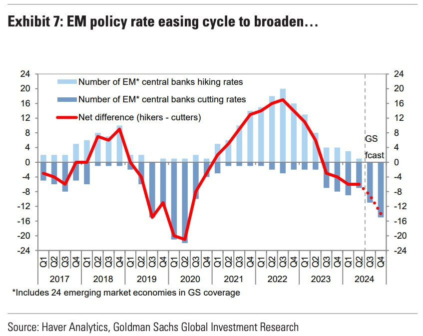 미 연준이 금리를 인하해준 덕분에 신흥국들 입장에서는 통화정책 여력이 확보되었습니다. 골드만삭스는 향후 기준금리를 인하하는 신흥국들이 더욱 많아질 것으로 보고 있습니다. 당연히 이는 우호적인 거시경제 환경을 제공할 것이고 주식 시장에 자금이 유입되기 좋은 환경을 만드는 것이죠.