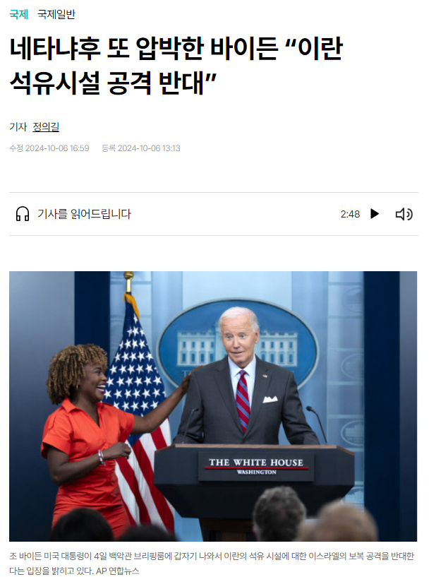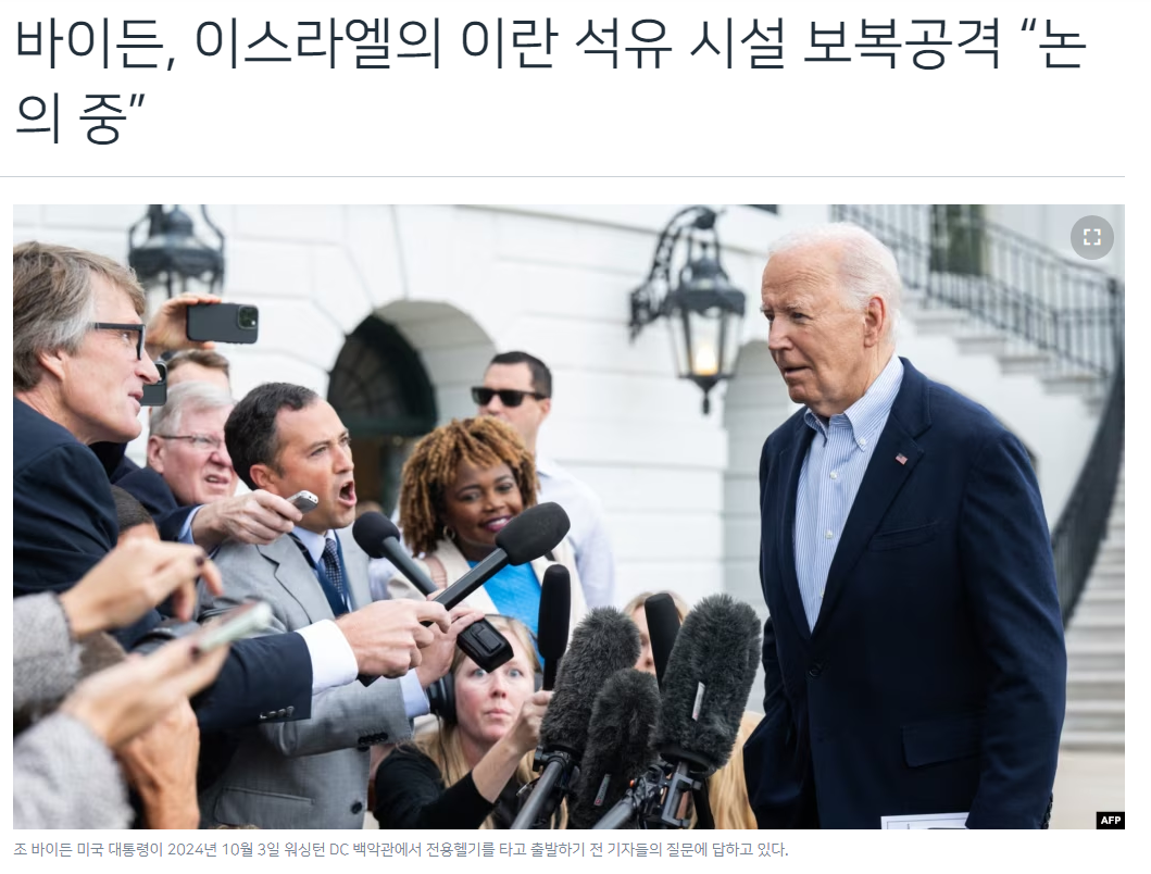 그렇게 유가가 급등해버리자 당황한 바이든은 이제 와서 공격하면 안 된다 하고 있지만... 이미 이스라엘은 미국의 손을 벗어난 지 한참입니다. 더 이상 말을 듣지 않습니다. 그래도 일단 명목상으로는 하지 말라고 해야 하니 말하는 느낌에 가깝습니다.