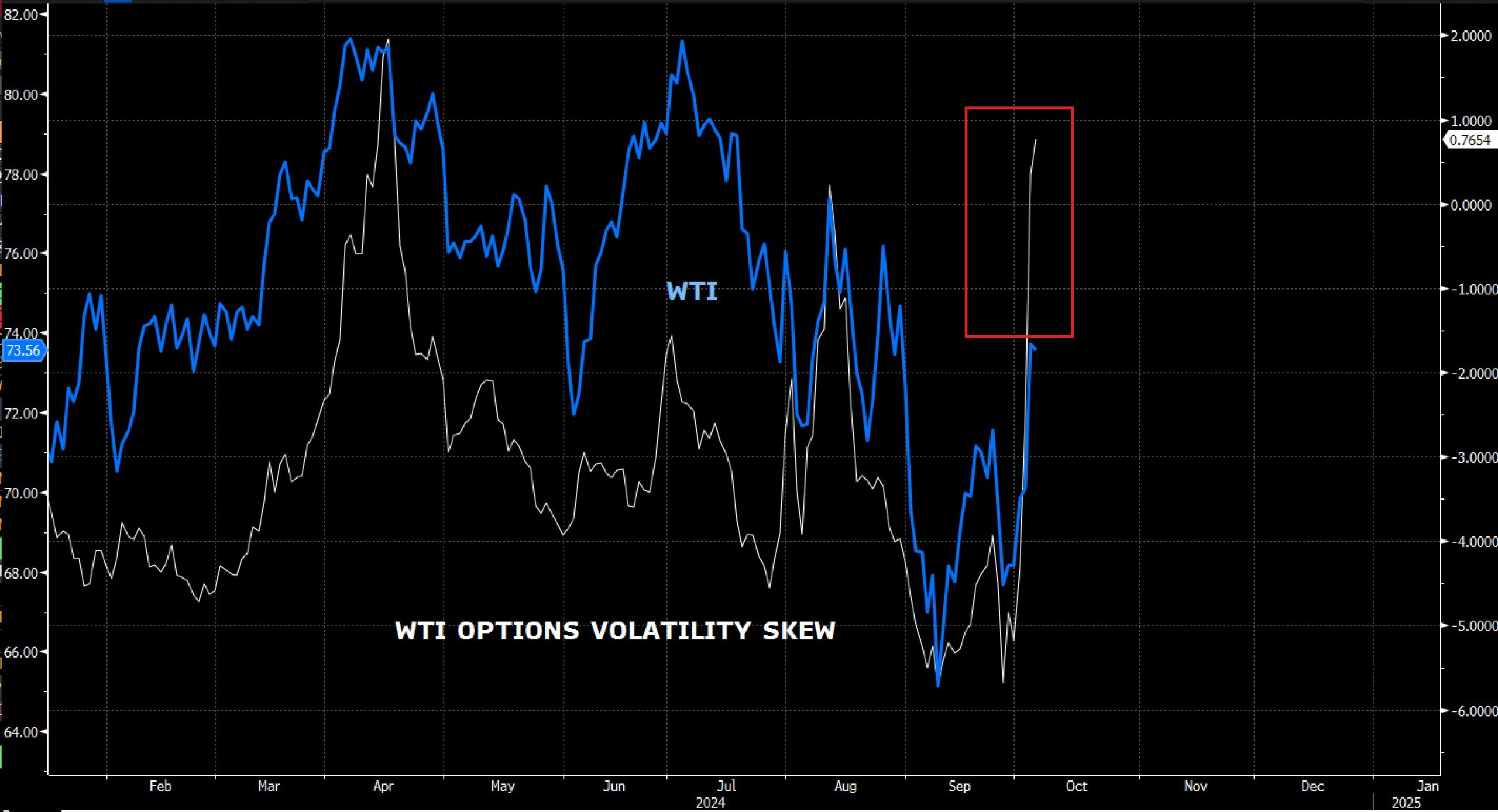 위 그래프에서 파란색 선은 WTI유 가격, 흰색 선은 옵션 변동성 스큐를 나타냅니다. CME 거래소에서 발표되는 스큐랑 일반적으로 계산되는 스큐랑 계산 방식이 조금 차이가 있기는 할텐데, 그래도 지금 스큐가 엄청나게 튄 것을 확인할 수 있습니다. 일반적으로 스큐는 콜옵션 가격 빼기 풋옵션 가격으로 계산됩니다. 근데 저게 지금 저렇게 상승하고 있다는 뜻은 그만큼 콜옵션 가격이 비싸지고 있다는 뜻이고, 콜옵션 가격이 비싸지고 있다는 뜻은 콜옵션 수요가 많다는 뜻이며, 콜옵션 수요가 많다는 뜻은 유가 상승에 베팅하는 사람들이 많다는 거죠.