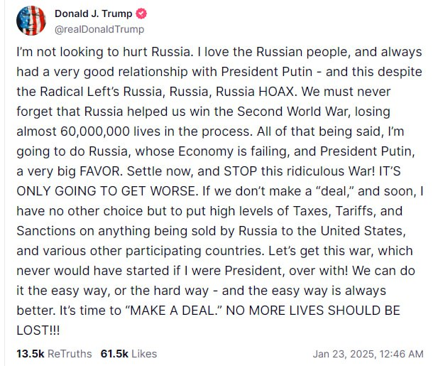 그 모든 점을 감안하여, 나는 경제가 악화되고 있는 러시아와 푸틴 대통령에게 아주 큰 호의를 베풀려 한다. 지금 당장 이 전쟁을 끝내고, 이 어리석은 전쟁을 멈추어야 한다! 상황은 더 나빠질 뿐이다. 우리가 "합의"를 이루지 못한다면, 그리고 그것이 곧 이루어지지 않는다면, 나는 러시아가 미국과 기타 여러 참가국에 판매하는 모든 것에 대해 높은 수준의 세금, 관세, 그리고 제재를 부과할 수밖에 없다.