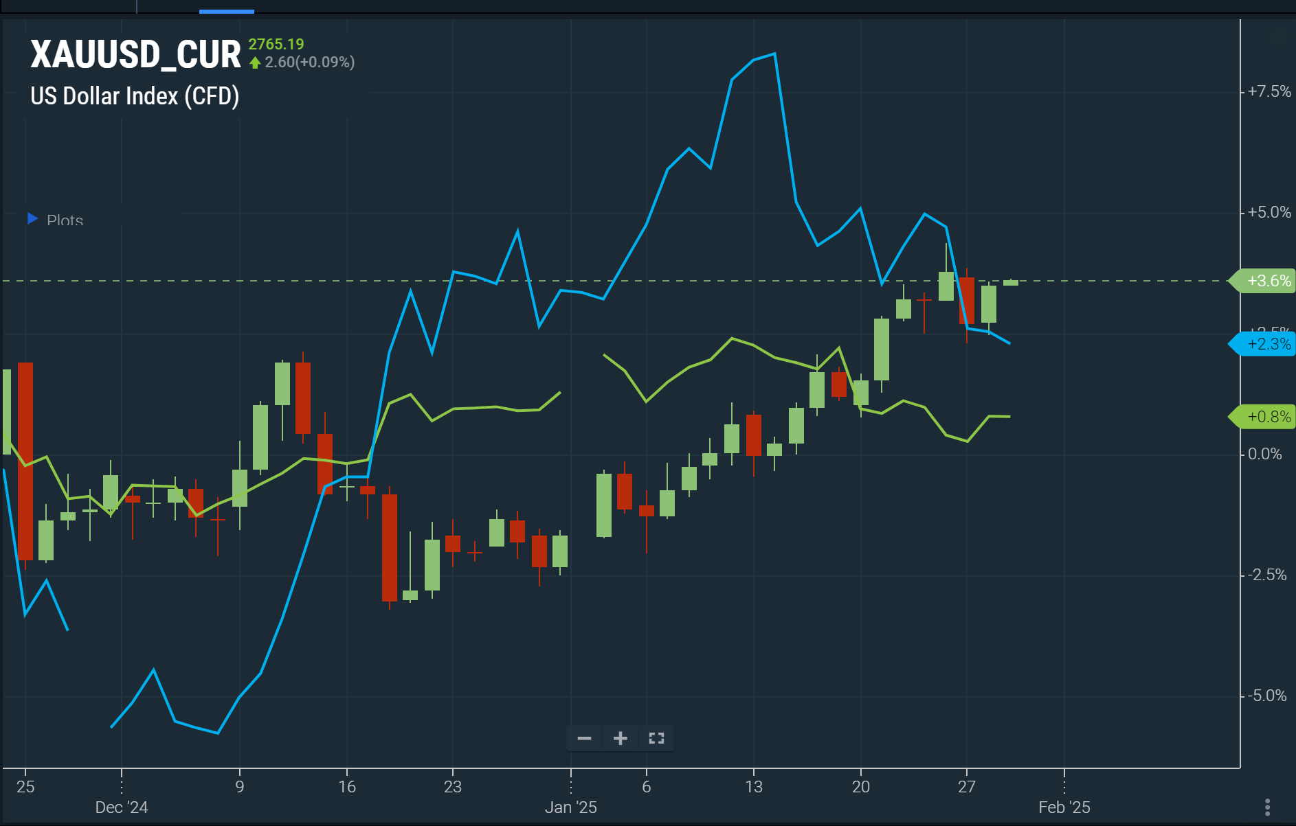 금(캔들), 미국 달러 인덱스(초록색 선), 미국 10년물 국채 금리(차란색 선) 추이