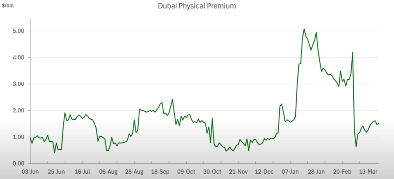 두바이유 현물 프리미엄(현물 - M2 스왑 가격), 출처: Onyx