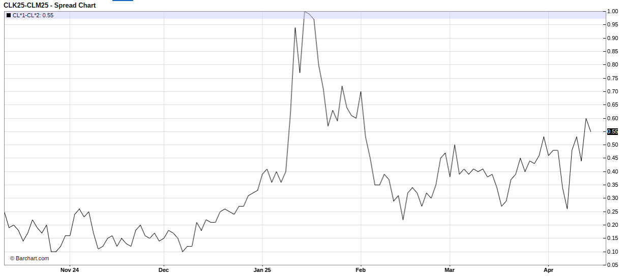 WTI유 타임 스프레드(time spread) - 근월물-차월물 스프레드, 출처: Barchart