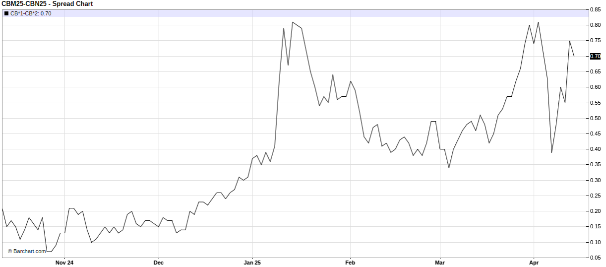 브렌트유 타임 스프레드(time spread) - 근월물-차월물 스프레드, 출처: Barchart