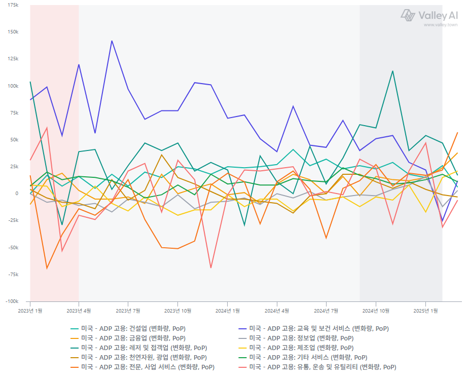 미국 ADP 업종별 고용, 출처: Valley AI