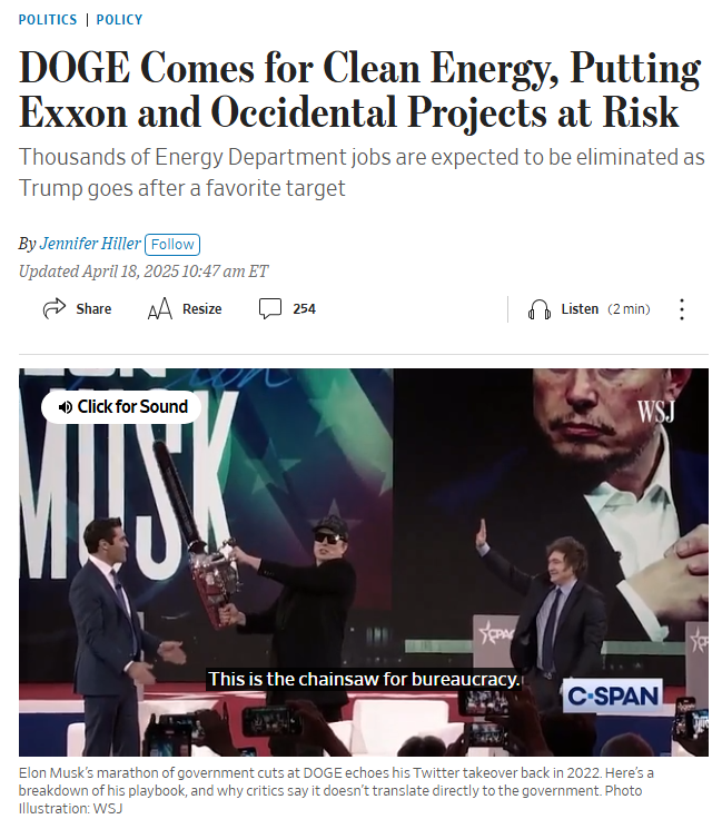 DOGE, 약 100억 달러 규모의 청정 에너지 프로젝트 연방 기금을 중단할 수 있는 대규모 삭감을 준비, 출처: WSJ