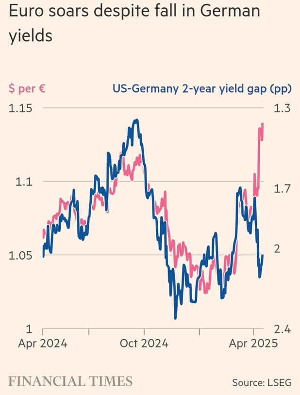 4월 2일 이후 시장을 계속해서 모니터링 하셨던 분들은 이미 알고 있는 현상이었을 겁니다. 달러 약세(유로와 엔은 강세)인 반면 국채, 특히 장기채 금리는 상승하는 현상. 이제는 시장이 굉장히 집중하고 있는 현상이 되었습니다. FT는 물론 블룸버그나 일반 신문 기사에서도 다루는 내용이 되었습니다.