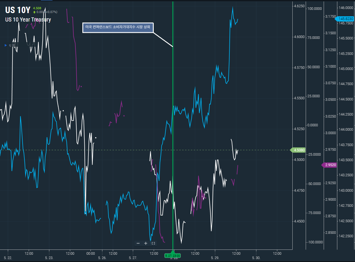 한국시간 기준 저녁 11시에는 미국 컨퍼런스보드 5월 소비자신뢰지수 확정치 발표가 있었습니다. 지난 발표에서는 지표가 꽤나 부진했는데, 이번 조사 마감일은 5월 19일로, 미국과 중국이 서로의 제품에 부과된 높은 관세를 일시적으로 줄이기로 합의한 이후이며 응답의 약 절반은 5월 12일 합의가 이루어진 뒤에 수집된 데이터였죠.