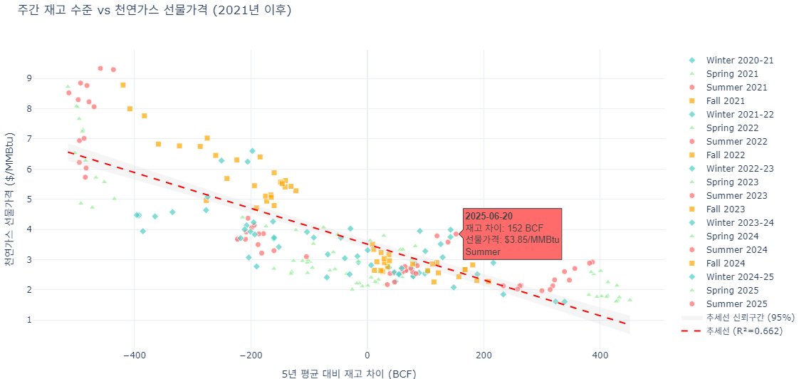 그래프 설명: 전 5년 평균 대비 재고 차이 vs. 천연가스 선물 가격 (출처: EIA)
