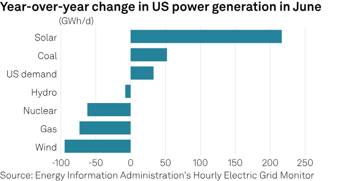 그에 반해 수요는 좋지 않았습니다. 특히 태양광 쪽에서 발전량이 늘어나면서 가스 대체재로서의 역할을 감당했고 가스 수요는 위축되었습니다. 6월 전력용 가스 수요는 40.4bcf/d로 전년동월 41.4bdf/d 대비 감소한 것으로 나타났죠.