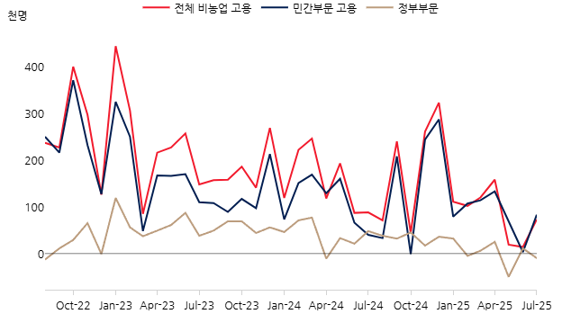 그렇다면 어디가 무너진 걸까요? 우선 상단에 있는 그래프를 보시면 사실 어디라고 할 것 없이 민간부문과 정부부문 모두 5월과 6월 들어 크게 감소한 것을 확인할 수 있습니다. 특히 정부부문의 경우 5월 속보치까지만 해도 민간부문 약세를 커버할만큼 강했던 것으로 나타났는데 상당 부분이 하향 조정되면서 전체 고용을 끌어 내렸습니다. 6월에는 정부부문이 일부 반등했지만 민간부문에서 3,000명의 고용만 발생하면서 전체 고용은 낮은 수준을 유지했습니다. 7월에는 다시 민간부문이 반등했지만 정부부문이 약세를 보이고 있습니다. 이 수치도 다음 달에 어떻게 변할지 알 수 없는 상황입니다.