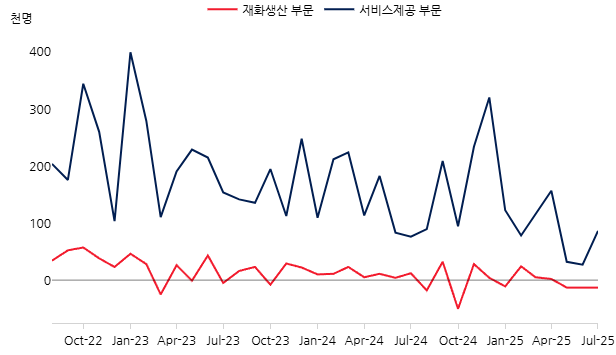 그래프 설명: 미국 재화생산(goods producing) 및 서비스제공(service providing) 부문 고용 변화 (출처: BLS)