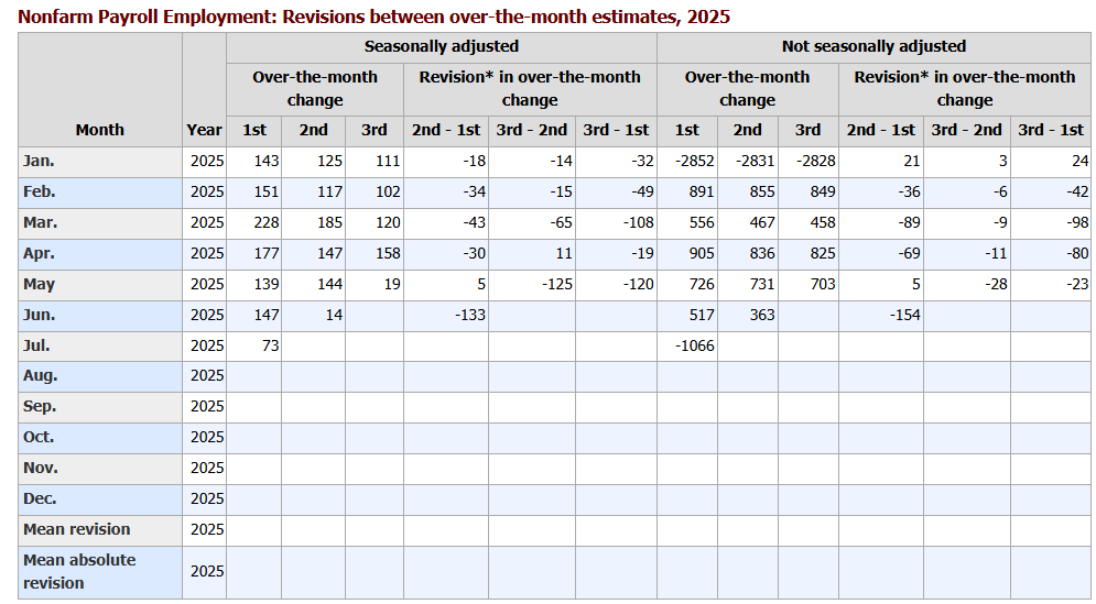 그 정도가 얼마나 심했냐하면, 5월과 6월 수치를 보면 됩니다. 가장 먼저 발표되었던 5월 비농업 고용 속보치는 13만 9,000명이었습니다. 이후 첫 수정에서는 오히려 5,000명이 늘어났었죠. 그런데 이후 이번 7월 수정에서 무려 12만 명이나 하향 조정되었습니다.