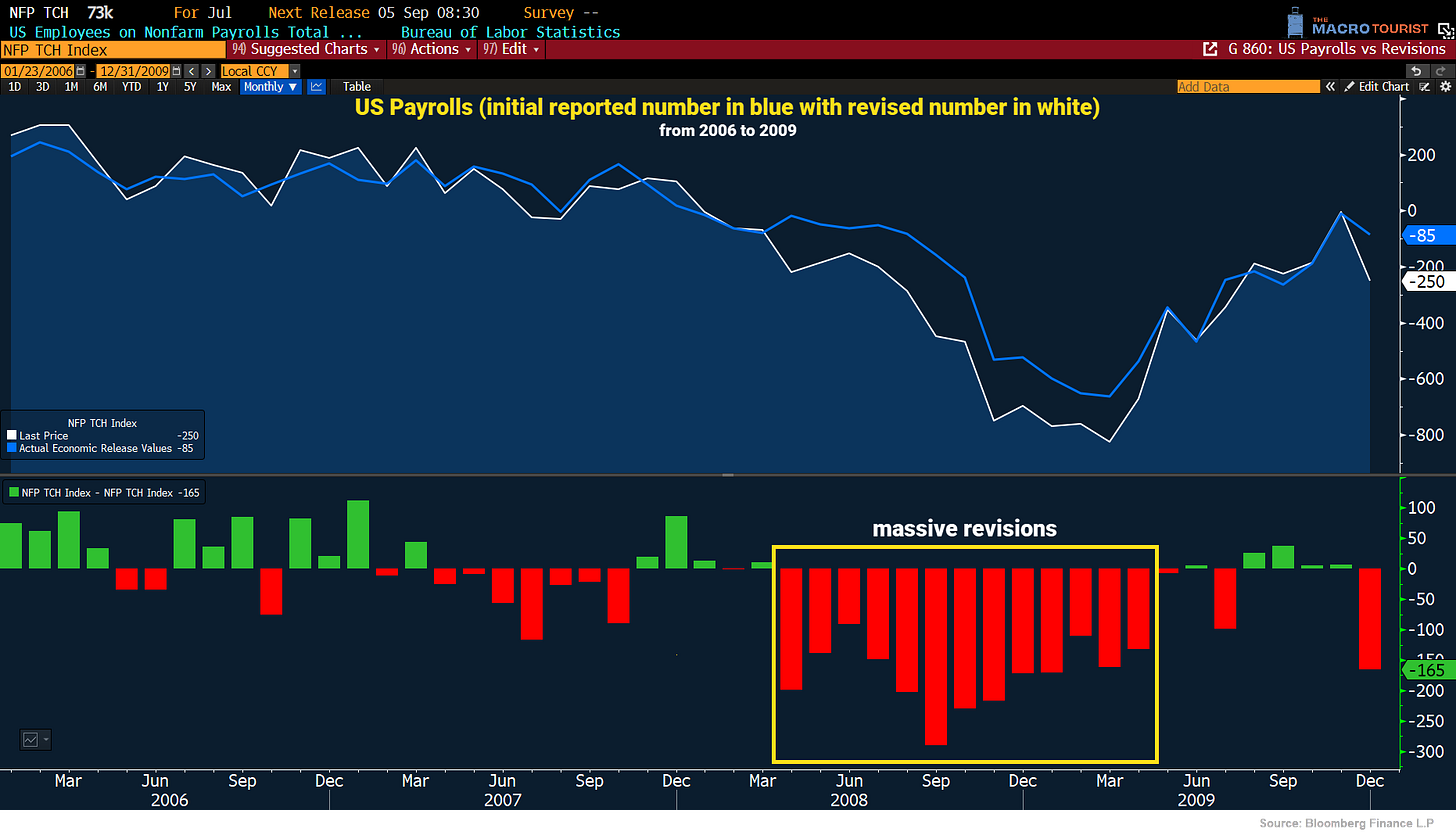 그래프 설명: 2006년에서 2009년 금융 위기 당시 (상) 파란색-비농업 고용 속보치, 흰색-수정 후...