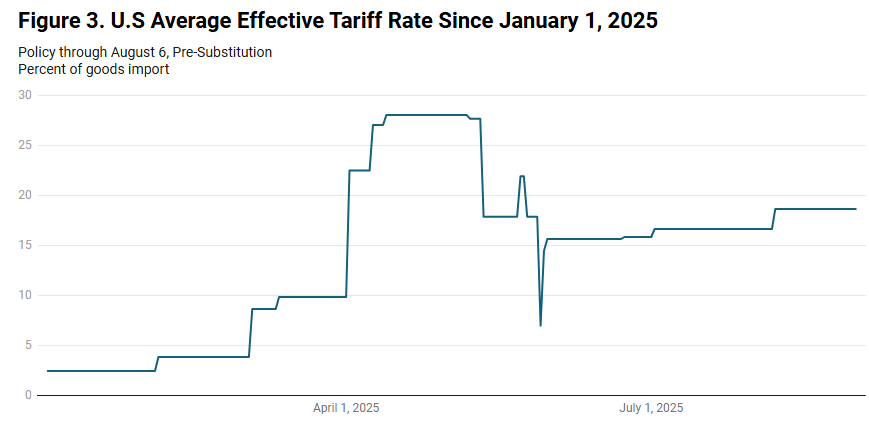 그래프 설명: 2025년 1월 1일부터 미국 평균 실질 실효 관세율 추이 (출처: 예일대학교 예산연구소)