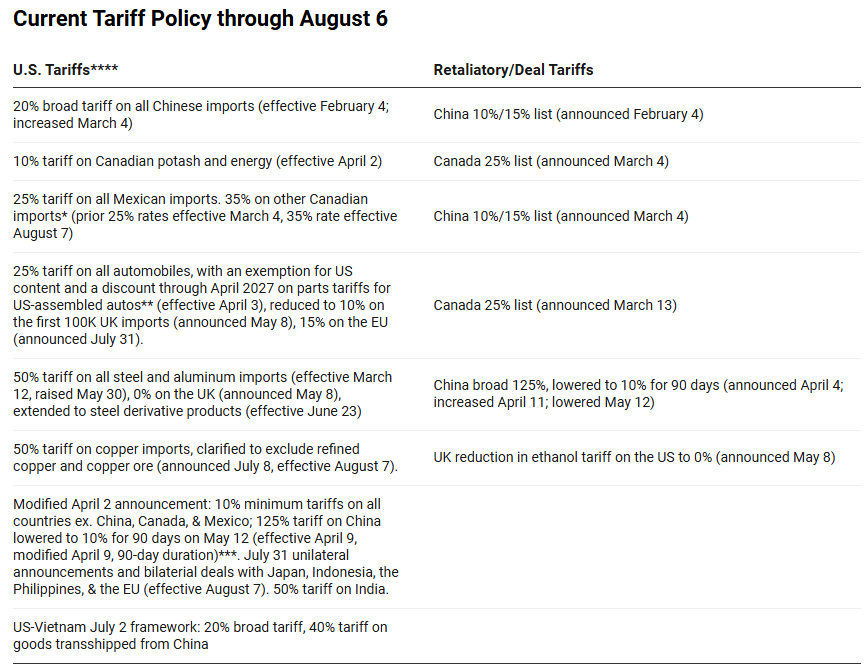 테이블 설명: 8월 7일자 기준 미국 관세 및 상대국 보복 관세 현황 (출처: 예일대학교 예산연구소)