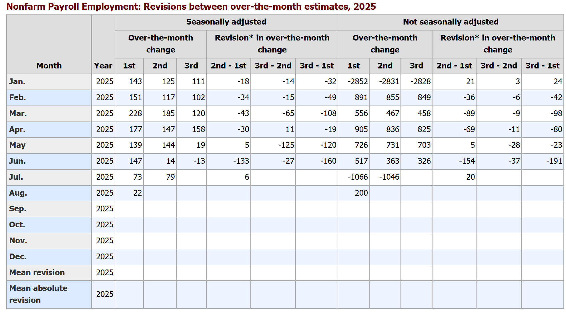 위 테이블은 미 노동통계국(BLS)에서 가져온 테이블입니다 (링크). BLS에서 조사하여 발표하는 비농업 고용 지표(Nonfarm Payroll)는 총 두 번 수정되는데요. 홈페이지에서 위 테이블과 같이 자세한 수치들을 다 확인할 수 있습니다.