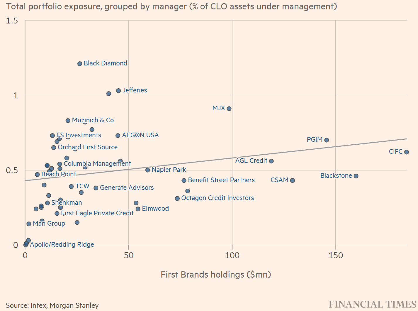 그래프 설명: CLO 매니저들의 First Brands 노출도 (X축: First Brands 대출액, Y축: 운영 중인 CLO 중 비중) (출처: Intex, Morgan Stanley, FT)