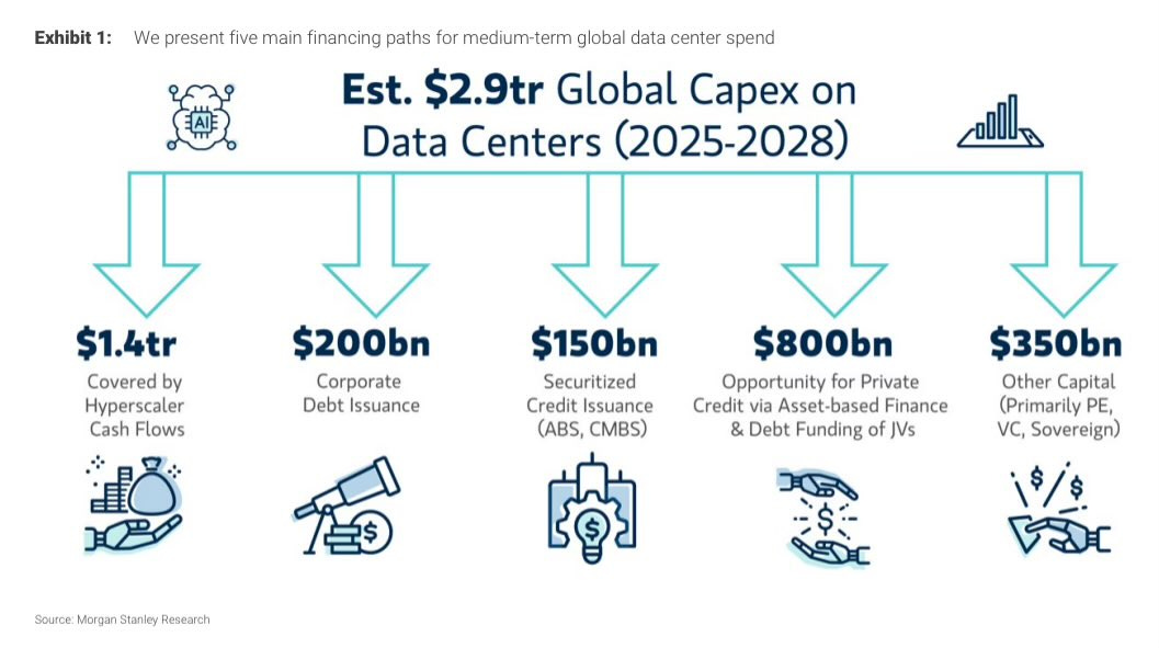 그림 설명: 2025-2028년 글로벌 데이터센터 자본지출 자금 조달 방식, 사모대출이 하이퍼스케일러 현금 다음으로 가장 큰 자금 조달 방식 (출처: 모건스탠리)