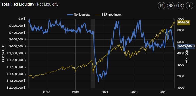 그래프 설명: S&P500 주가지수와 연준 순유동성(Net Liquidity) 추이 (출처: FRED, Streetstats)