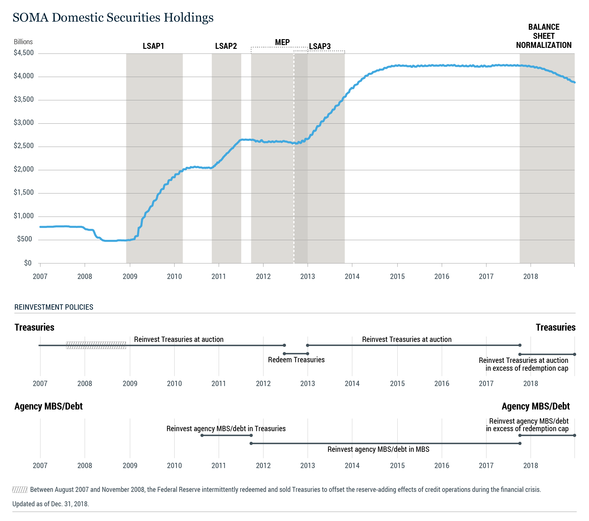 그래프 설명: 연준 대차대조표(SOMA) 보유 증권 추이. QE1, QE2, QE3를 거쳐 급격히 증가한 모습을 볼 수 있음 (출처: Federal Reserve Bank of New York)