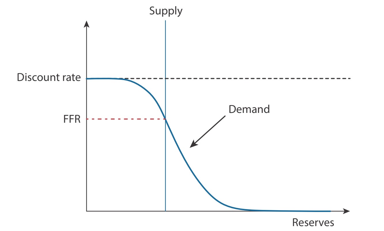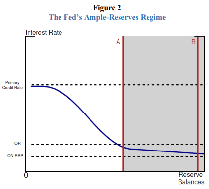 그림 설명: 풍부한 지준(Ample Reserves) 환경. 공급 곡선이 오른쪽 회색 영역(Ample)으로 이동. 이제 공급이 변해도 금리는 변하지 않음 (출처: Federal Reserve)