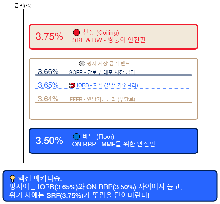 도식 설명: 연준의 금리 코리도어 시스템 (2025년 12월 기준). 바닥(ON RRP 3.50%)과 천장(SRF & DW 3.75%) 사이에서 시장 금리들이 안정적으로 움직이는 구조.