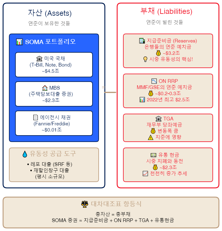 연준의 "오른손"인 대차대조표 정책(QE, QT)을 이해하려면, 먼저 연준의 대차대조표가 어떻게 생겼는지 알아야 합니다. 일반 기업이나 은행의 대차대조표와 비슷하게, 연준도 자산과 부채로 구성되어 있습니다.