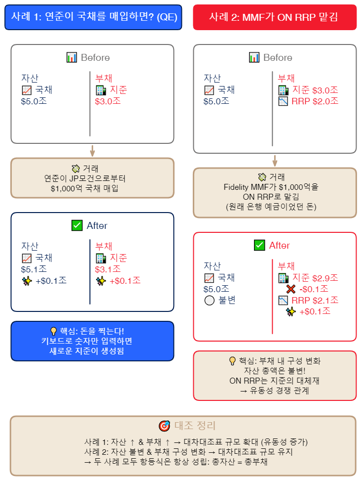 자산 총액은 변하지 않았습니다. 부채 내에서 구성만 바뀐거죠. 이게 바로 ON RRP가 지준의 "대체재" 역할을 하는 이유입니다.
