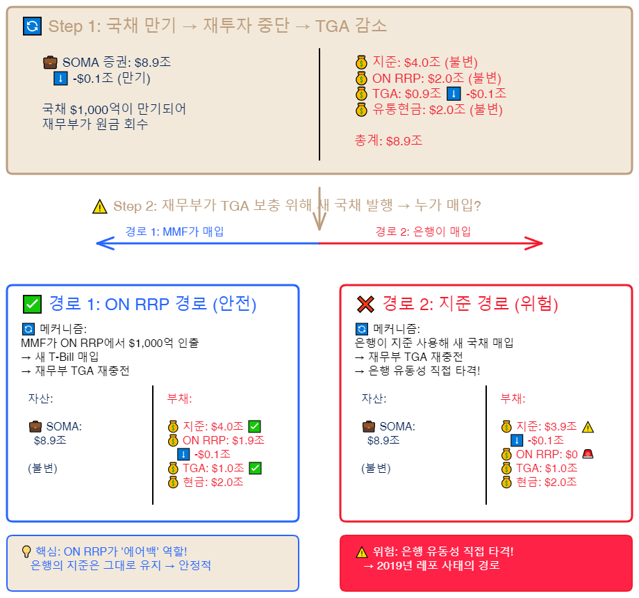 연준이 재투자를 하지 않으면, 재무부가 원금을 상환합니다. 재무부는 TGA(재무부 계정)에서 연준에 1,000억 달러를 지불하고, 연준의 국채 보유가 1,000억 달러 줄어듭니다.