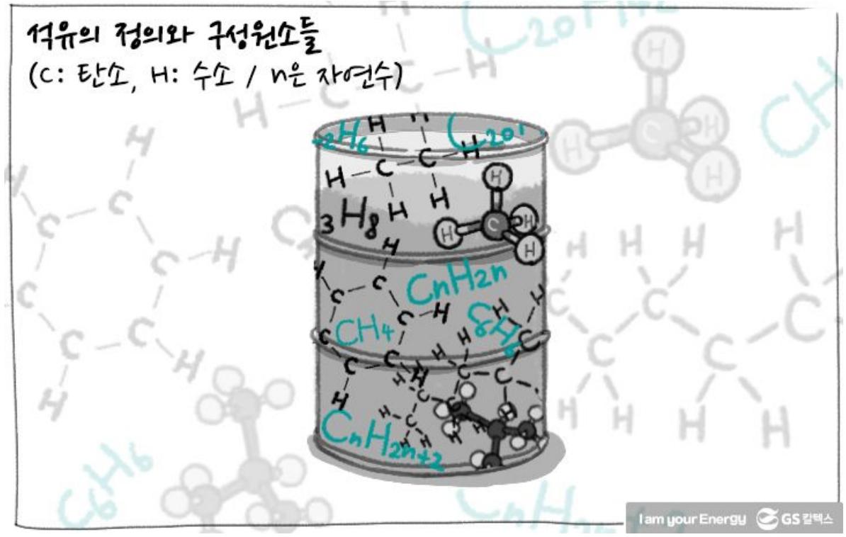 이미지 설명: 탄화수소 분자 구조. 탄소(C)와 수소(H)의 결합으로 구성된 다양한 분자들이 혼합되어 있음 (출처: GS칼텍스 에너지학개론)