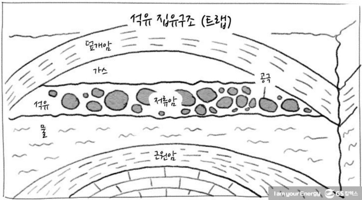 이미지 설명: 유전의 트랩(집유구조). 근원암에서 생성된 석유가 저류암으로 이동한 뒤, 덮개암에 의해 빠져나가지 못하고 배사구조에 집적되는 모습. (출처: GS칼텍스 에너지학개론)