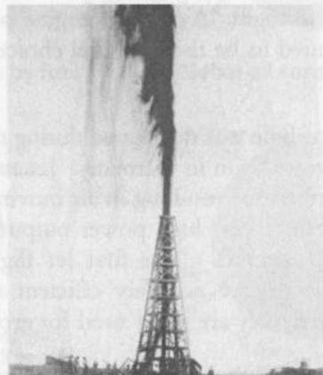 이미지 설명: 1901년 텍사스 스핀들탑(Spindletop) 유전. 하루 10만 배럴 이상을 분출하며 미국 석유 산업의 폭발적 성장을 촉발 (출처: Morgan Downey의 Oil 101)