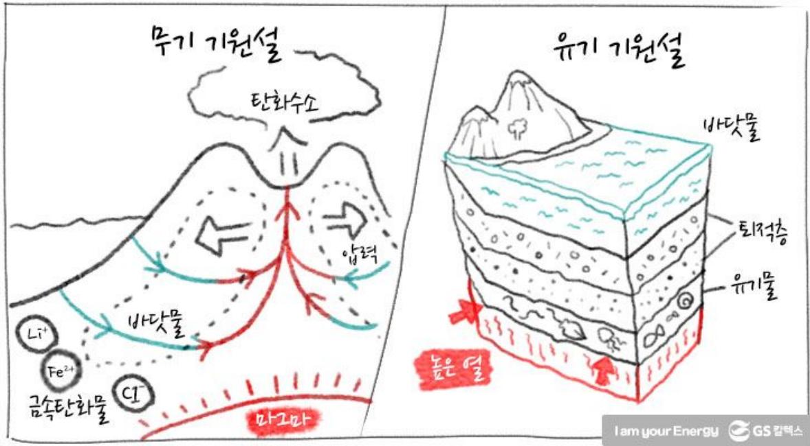 이미지 설명: 석유 형성에 관한 두 가지 이론 — 유기 기원설과 무기 기원설. 현재는 유기 기원설이 주류 이론으로 받아들여지고 있음 (출처: GS칼텍스 에너지학개론)