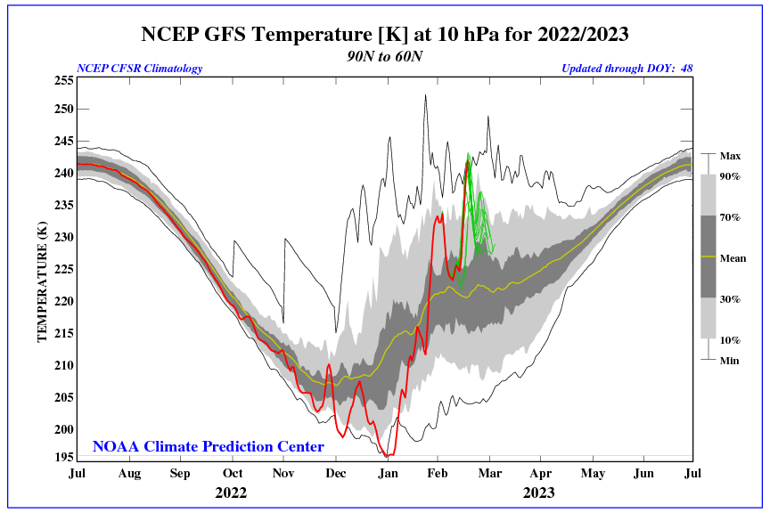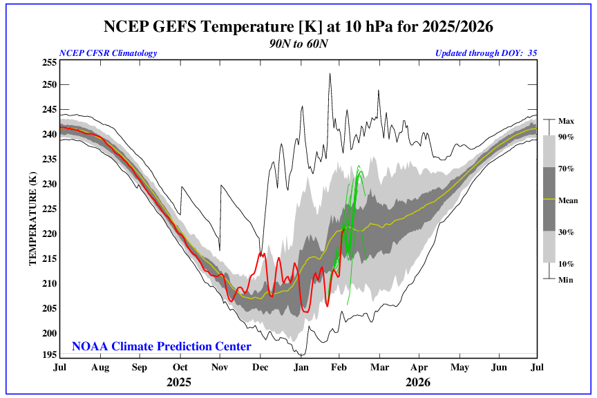 그림 설명: NCEP GFS 성층권 온도 차트(10 hPa, 90N-60N). 빨간색 선이 해당 시즌의 실제 온도이며, 회색 영역이 기후 평년값의 분포 범위. SSW 발생 시 빨간색 선이 급격하게 상승하는 것을 볼 수 있음 (출처: NOAA Climate Prediction Center)