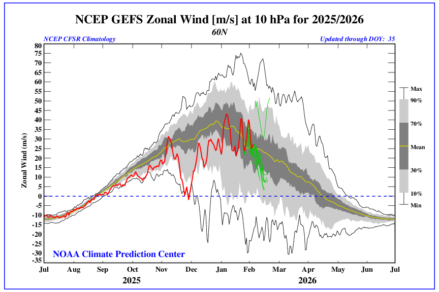 그림 설명: GEFS 모델의 성층권 기온 예측 차트 (출처: NOAA CPC)