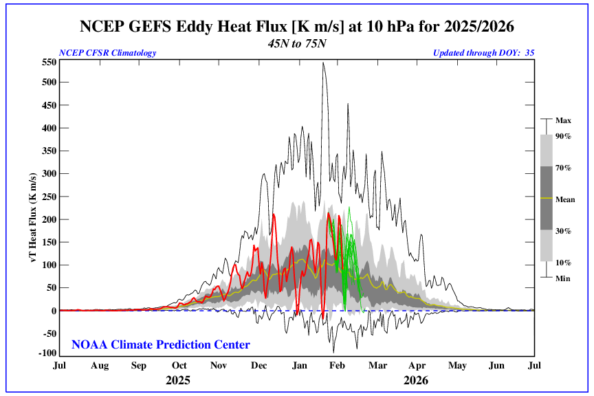 그림 설명: GEFS 모델의 10 hPa 고도 에디 열속(Eddy Heat Flux, vT) 예측. vT 값이 평년(회색 영역) 대비 크게 증가하면 1-2주 내 SSW 발생 가능성이 높아짐. 빨간선은 관측값, 녹색선은 16일 예측 (출처: NOAA CPC)