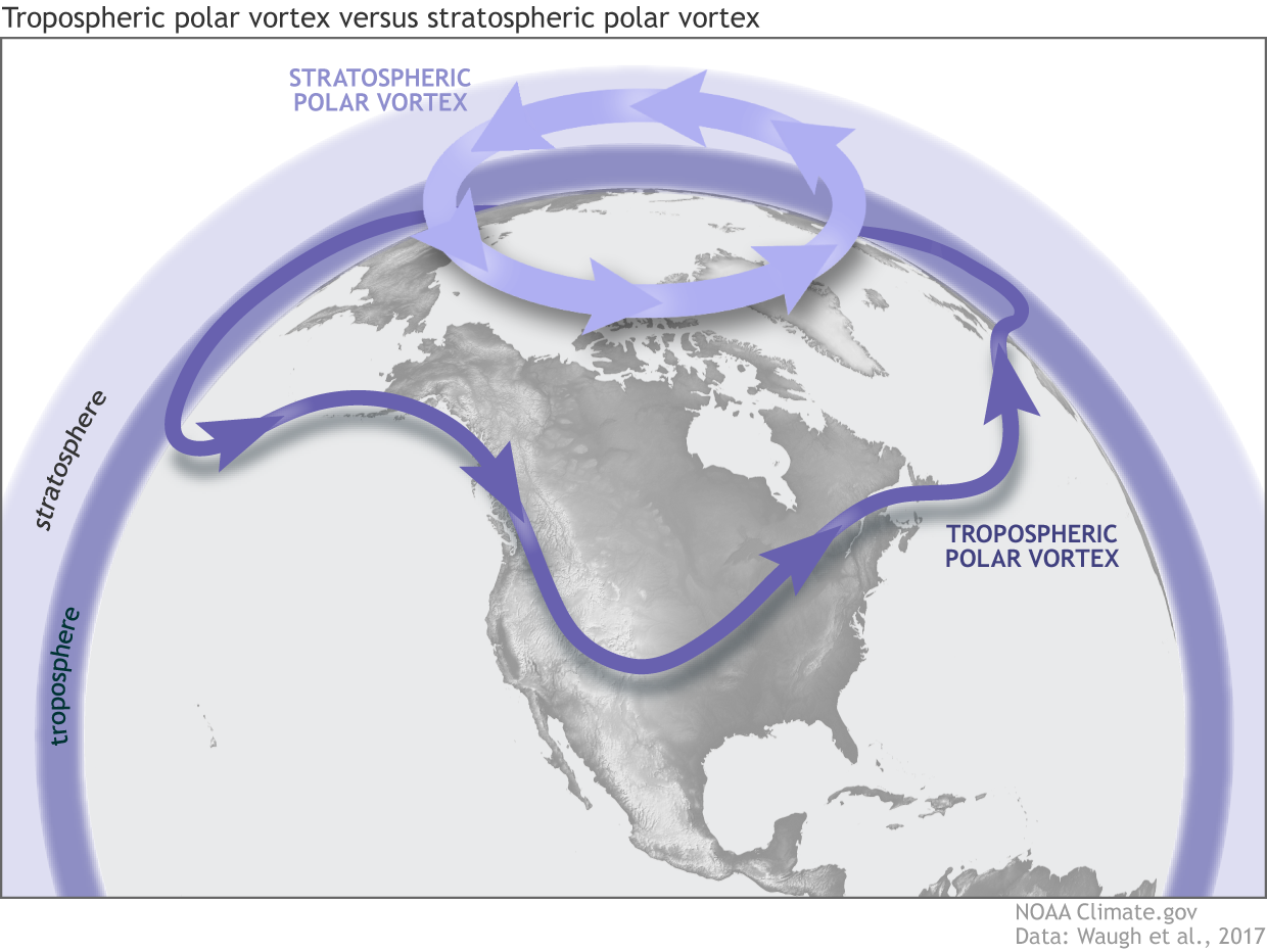 그림 설명: 성층권 폴라 보텍스와 대류권 폴라 보텍스의 차이. 성층권 폴라 보텍스는 더 높은 고도에서 북극 위를 감싸며, 대류권 폴라 보텍스는 지상에 가까운 제트기류 수준에 위치 (출처: Climate.gov, Waugh et al., 2017)
