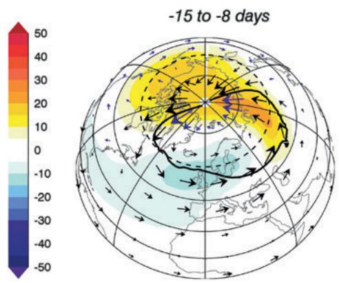 SSW의 지상 영향은 보통 1-3주의 지연(lag) 이 있습니다. 성층권의 이상 신호가 대류권으로 내려오는 데 시간이 걸리기 때문이죠. 피크 영향이 1-3주 뒤에 나타나고, 수 주에 걸쳐 한파 리스크가 높아지는 패턴이 문헌에서 반복적으로 나타납니다.