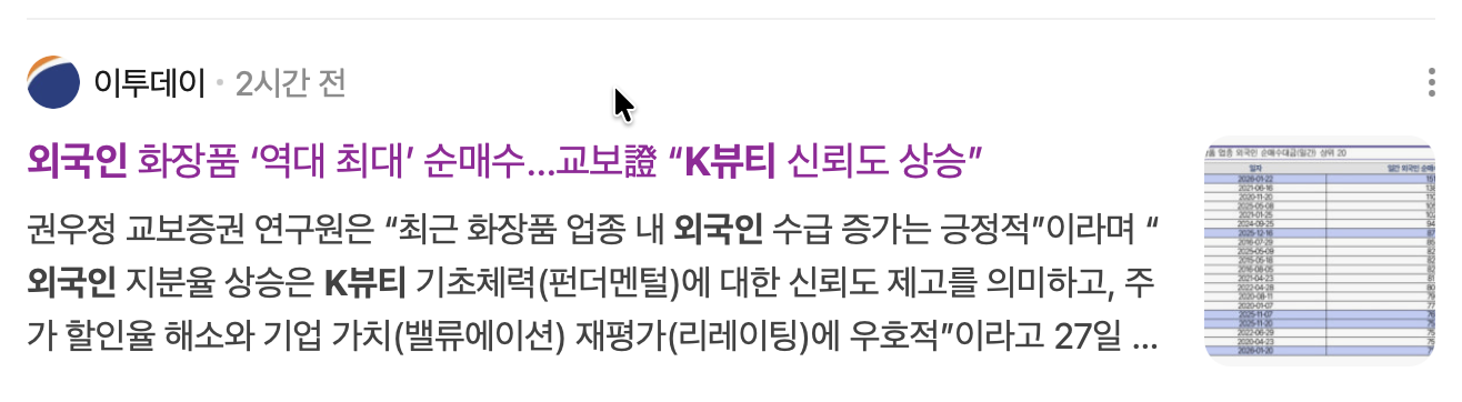 기록 경신: 교보증권에 따르면 지난 1월 22일 화장품 업종의 외국인 일일 순매수 규모는 1,513억 원으로 집계되어 일일 기준 역대 최대치를 기록했습니다.