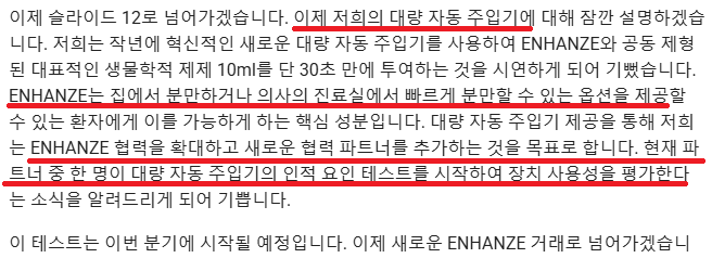 만약 새로운 기술로 특허가 난다면.... 어떻게 특허 기간이 형성될지 모르겠다. ENHANZE의 수명을 크게 늘릴 수 있는 기회 중 하나라도 본다.