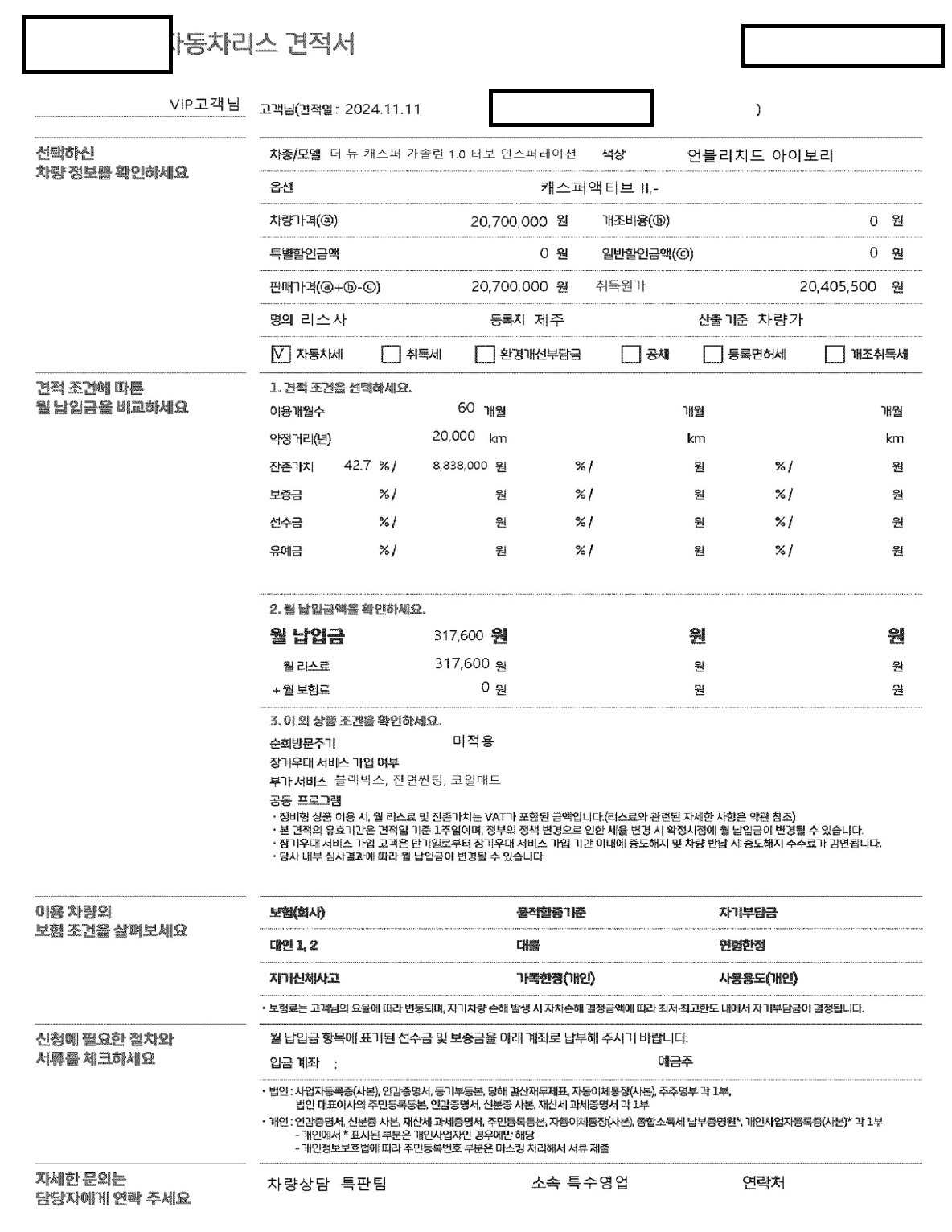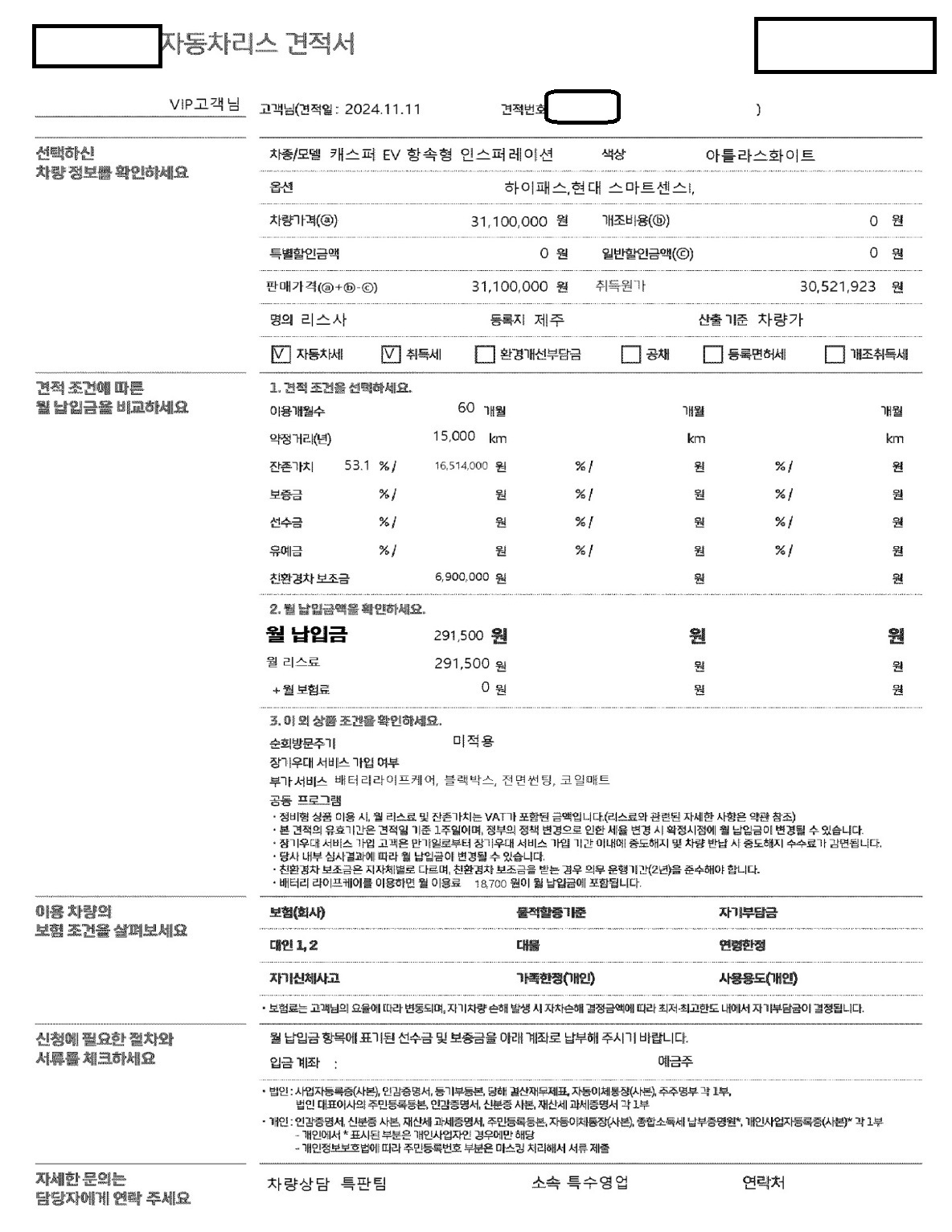 하지만, 반대로 보면 저런 조건으로 제공하는 곳 보다 낮은 업체를 찾아야 하는데 장기렌트는 견적 뽑아보니 캐스퍼 전기차 기준 40만원 초반대가 나왔습니다.