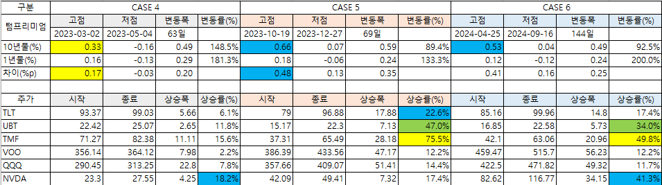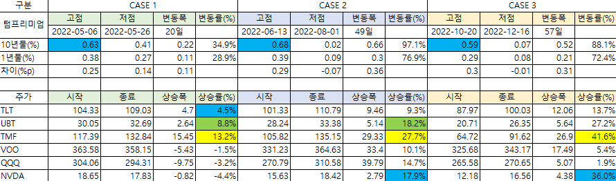 다음은 텀프리미엄이 하강하는 동안 20년물 미국 장기국채 ETF인 TLT, UBT(2배 레버리지), TMF(3배 레버리지)의 주가추이입니다. 최근 3년간 총 6번의 경우를 보면 하강기간은 짧게는 1.5개월, 길게는 5개월까지 발생했습니다. 이 기간 동안 TLT는 적게는 4.5%에서 많게는 22.6%까지 상승했습니다. 짧은 기간을 고려하면 상당한 수익률이 아닐 수 없습니다. 텀프리미엄과 채권가격 간에는 상당히 유의미한 상관관계가 있어 보입니다.